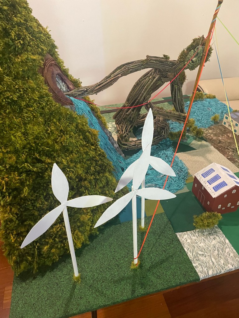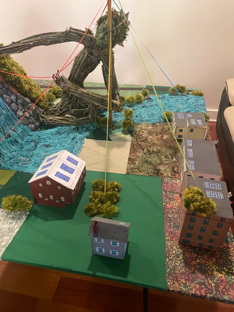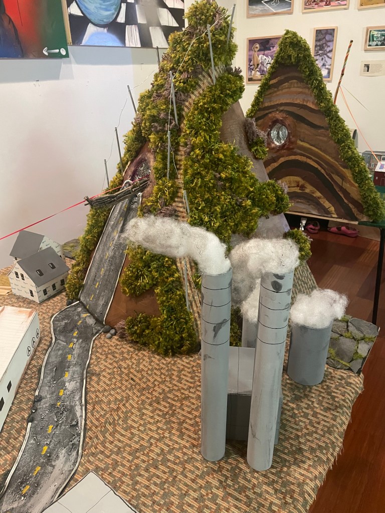 A: Yeah. It's in two, four x four squares on top of a table. The highest point is like, shoulder height. The lowest point would probably be like, your lower hip. So say it's about five and a half feet off the ground altogether. If you walk up to it, you're going to see DreamWeaver, and you're going to see a big mountain that's kind of scraggly. Below the mountain, well out of the mountain, you see a road coming out of a portal, and you see a bunch of really grayish buildings and some smokestacks polluting the air, and you see a figure asleep in a bed. You realize that DreamWeaver is giving this figure a dream. The dream is starting with an image of the current Lancaster county and possibly more future, which is very industrialized on this beautiful farmland. But you go through the portal, actually, you see coming out of the portal a hand made of what looks like trees holding a red ribbon, and the red ribbon connects to the figure and DreamWeaver, and it's something that's being offered. If you walk through there, you can actually walk in between the two mountain sides.